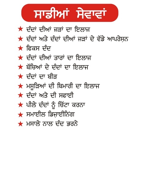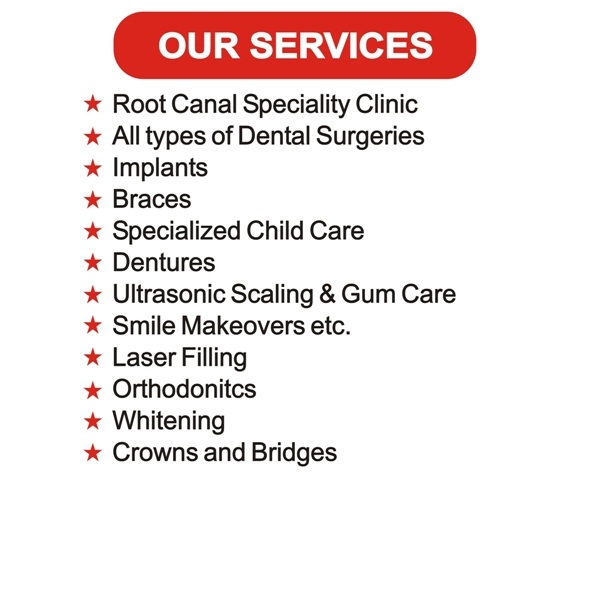 We provide the services in our Dental Wing Root Canal, Implants, Braces, Child Care, Dentures, Ultrasonic Scaling & Gum Care, Smile Makeovers, Laser Filling, Orthodontics, Whitening, Crowns and Bridges and all types of Dental Surgeries.